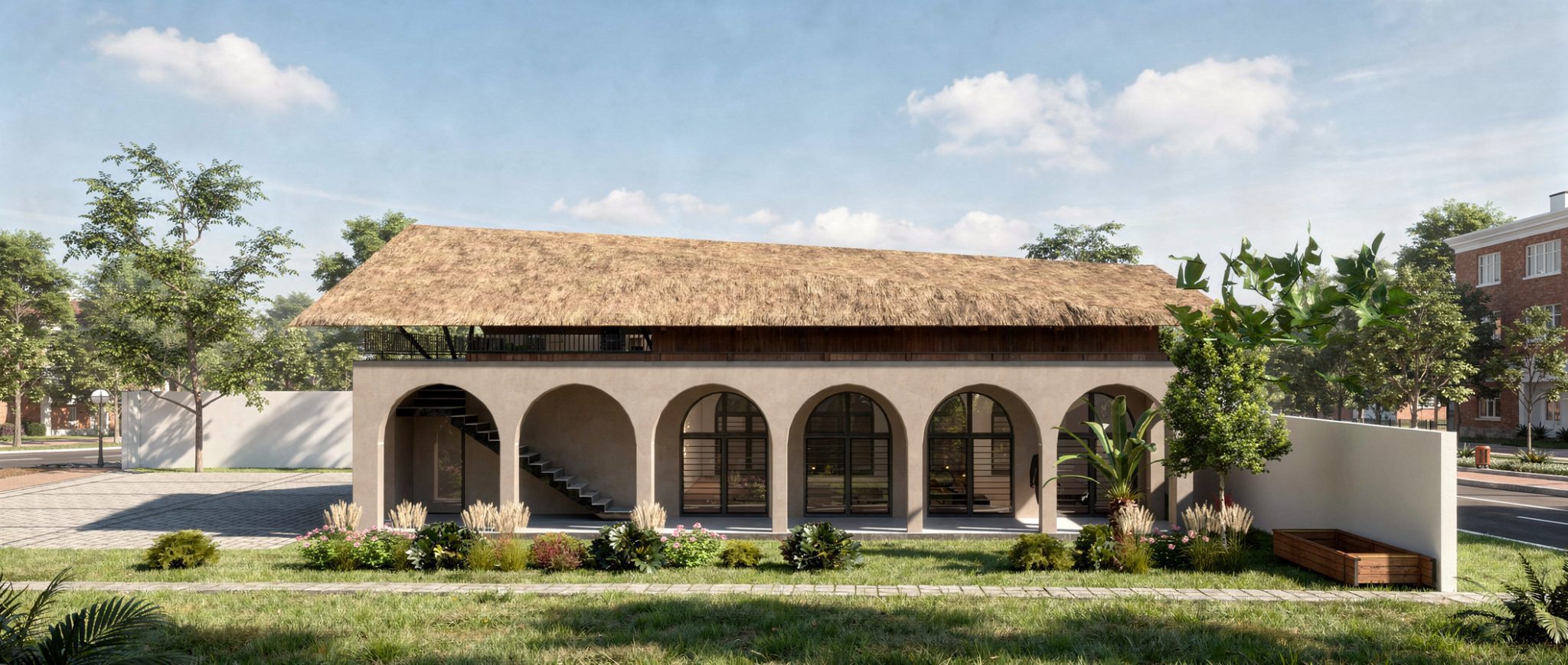 The pavilion is designed to be completely open and breathable. The structure features a soaring, overhanging roof that provides deep shade, protecting the open roof as well as the interior from the intense sun and tropical rains while allowing for constant, natural airflow.